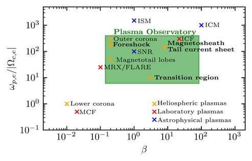 Despite important differences, these environments show similarities, in particular highlighted by adopting adimensional parameters. In this perspective, the below figure categorizes some of these environments in the β – ωp,e/Ωc,e parameter space, where β is the kinetic-to-magnetic pressure ratio, ωp,e is the electron plasma frequency, and Ωc,e is the electron cyclotron frequency. The green box highlights the region where Plasma Observatory aims at providing unprecedented multi-scale multi-point measurements.